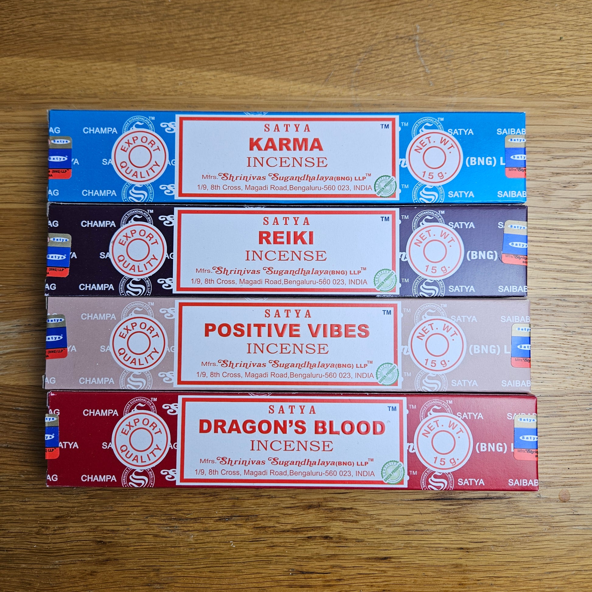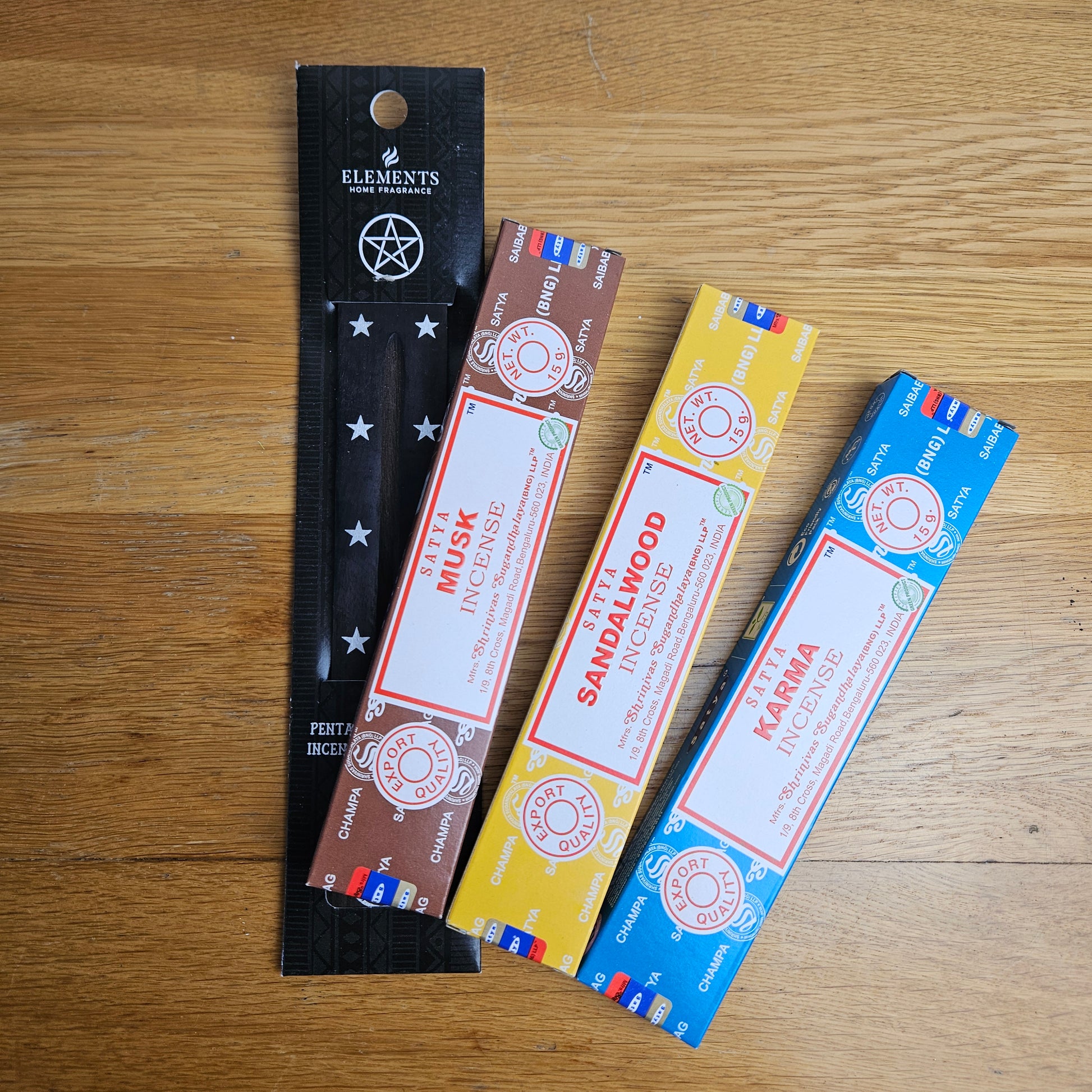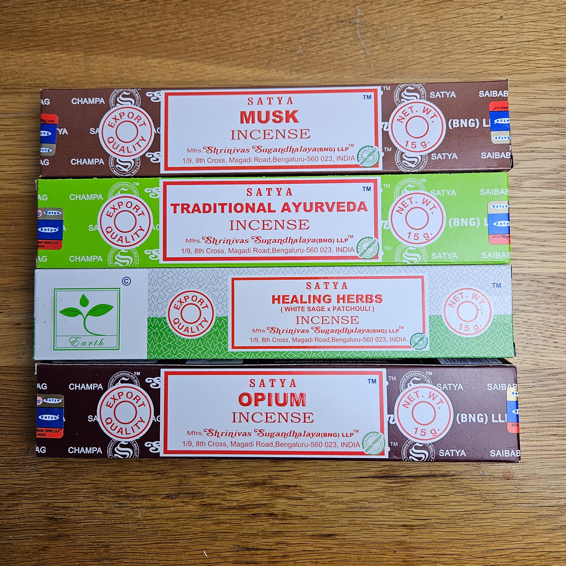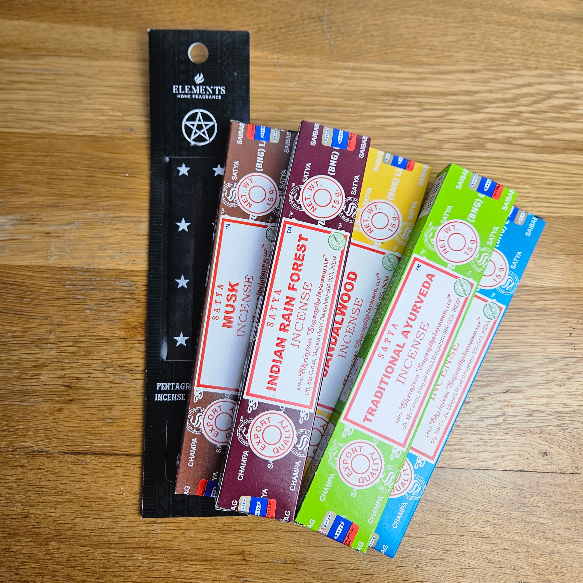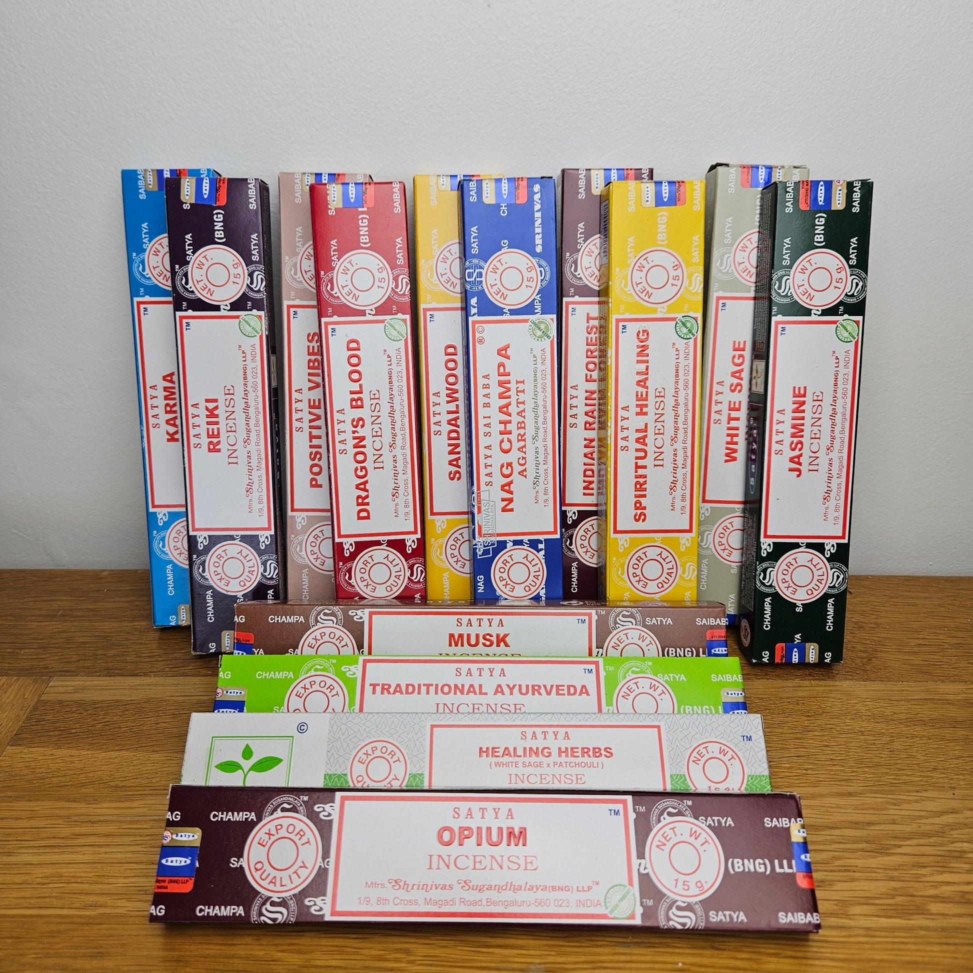 Nag Champa (grounding), Dragon’s Blood (protection), Jasmine (love & intuition), Spiritual Healing (cleansing), Reiki (balance), Karma (growth), Opium (transformation), Rose (self-love & compassion), Lavender (calm & relaxation), Patchouli (abundance & grounding), Musk (confidence & mystery), Vanilla (comfort & harmony), Sandalwood (clarity & spiritual focus)